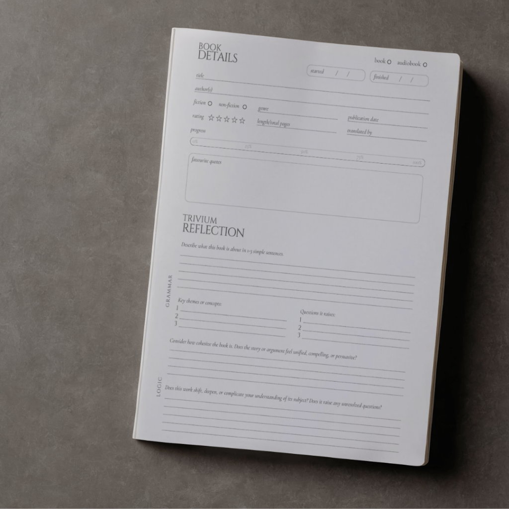 My free Trivium Reading Journal Page gives you a simple, classical structure to understand, analyze, and respond thoughtfully to any book.